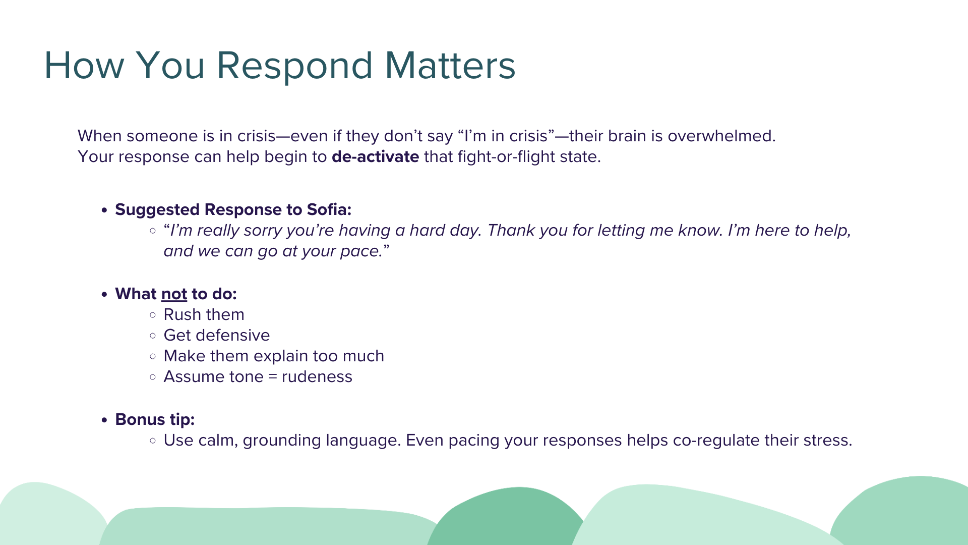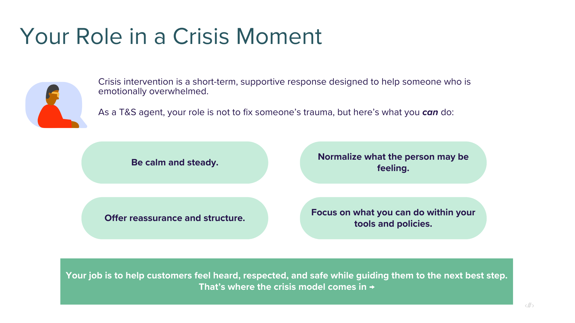 The program blended real-world case studies, roleplay, and the NOVA crisis response model to help teammates confidently identify, escalate, and document crisis-related tickets, while protecting their own boundaries and mental health.