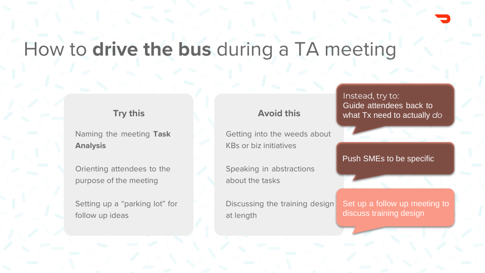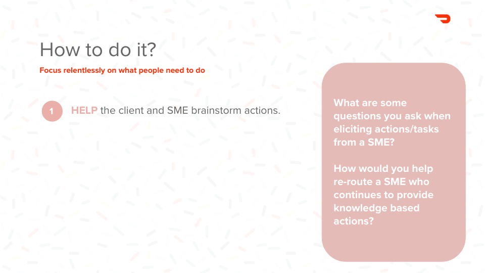 When I joined the DoorDash LXD team, there weren’t any formal task or needs analysis processes in place. Noticing this as an area of opportunity, I led a professional development workshop session and built a task analysis template for the team.