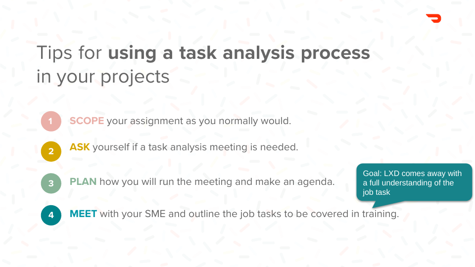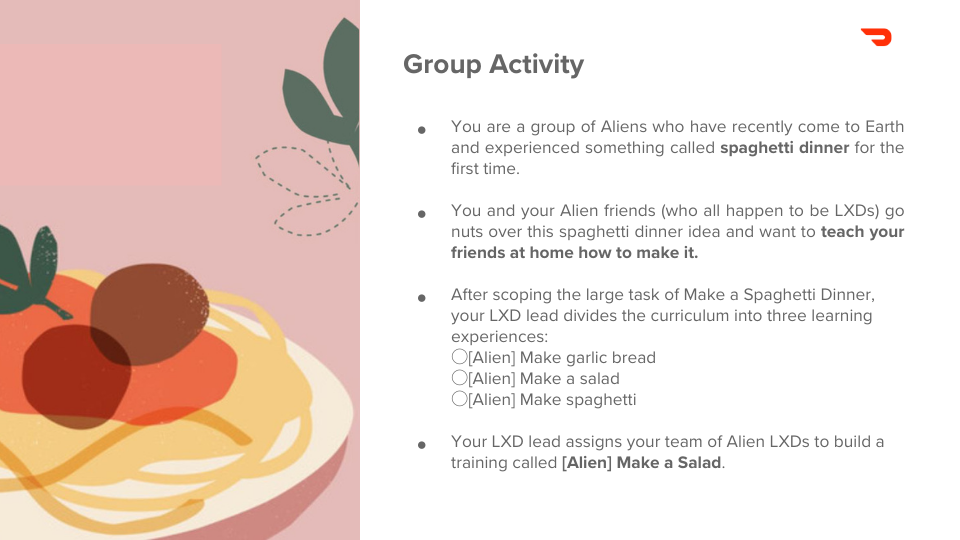 For this professional development-focused project, I created a task analysis template and conducted an upskill training for the Learning Experience Design team at DoorDash. The virtual training guides Learning Experience Designers (LXDs) to conduct a task analysis through hands on practice.